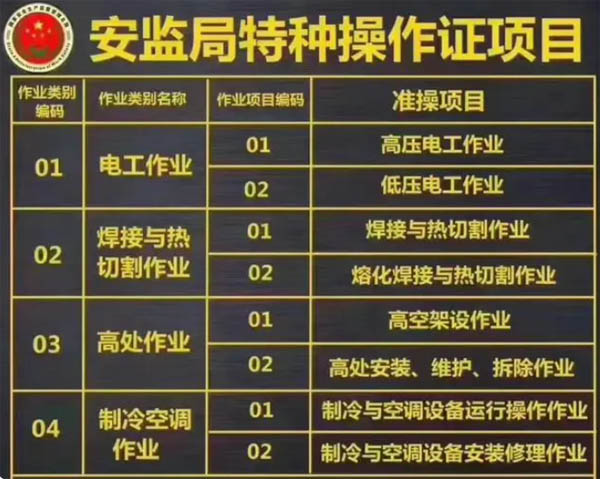 特種操作證項(xiàng)目: